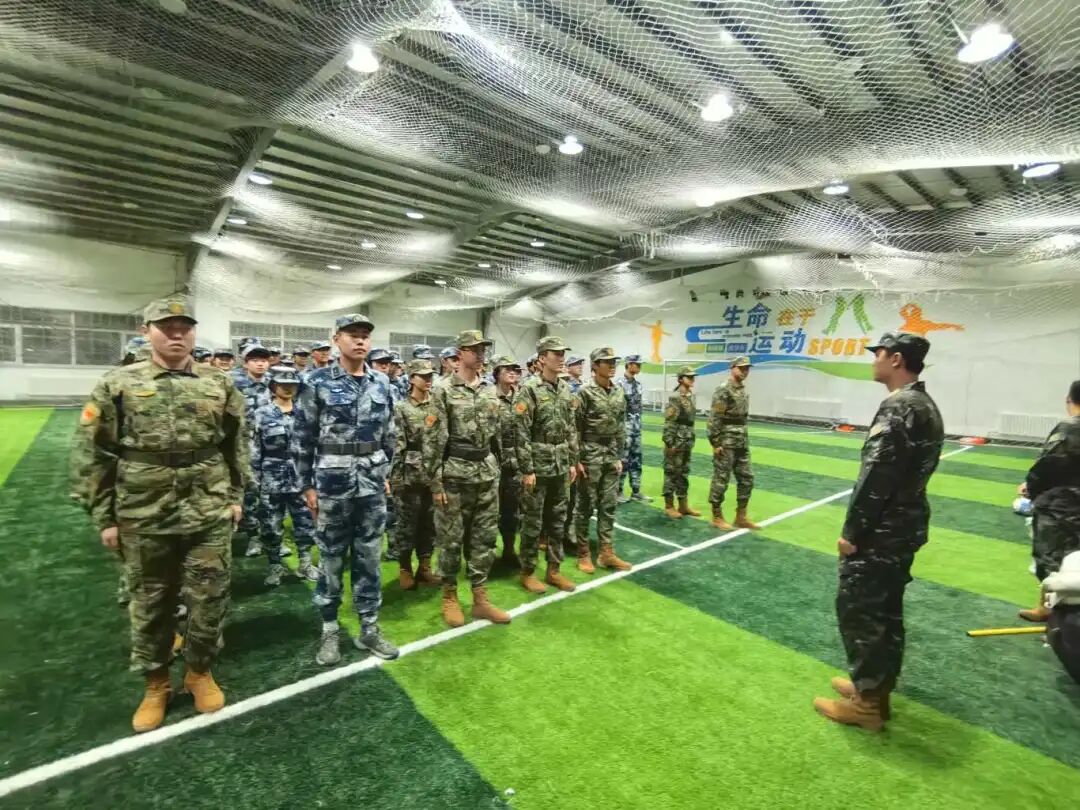 夜幕降临,训练馆内的灯光亮起,照亮了队员们整齐的队列。抬手、摆臂、踢腿、落地,每一个动作都力求标准规范:手臂摆动如精准的钟摆,指尖绷直指向远方;踢腿时膝盖绷直、脚尖下压,脚掌与地面平行,落地时沉稳有力,发出整齐划一的声响。汗水浸湿了作训服,额前的碎发黏在脸庞,但没有人停下脚步,眼神中的坚定未曾有半分动摇。